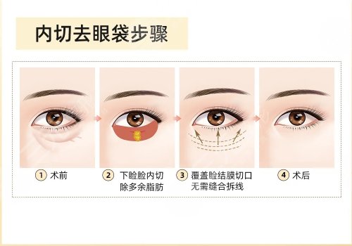 内切去眼袋:主要是针对脂肪膨出,但是眼袋肌肤轻度松弛的姐妹,医生在手术之前会先进行清洁,再靠近睫毛根部的内侧做一个小的切口,然后将多余的眶隔脂肪去除,这样就可以使眼袋部位变得更加平整。通常切口是比较小的,所以一般不会留下难看的疤痕,术后要注意保持手术部位的清洁干燥,多吃一些清淡的食物。