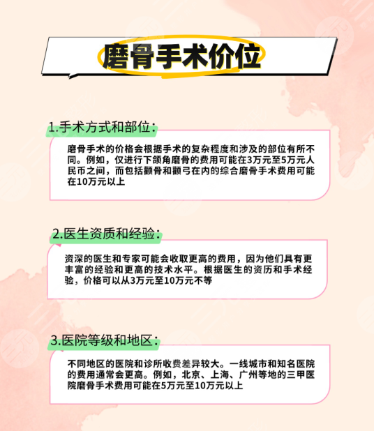 ·骨骼修复材料:若磨骨后需骨质固定,需额外支付材料费用5000-10000元。