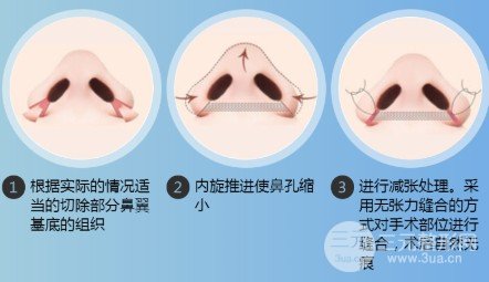按照所述多种鼻翼情况的不同,可以挑选不同的手术修复方法,才能够合理的借助手术来缩鼻翼,得到完善的鼻翼果,具体做法如下: