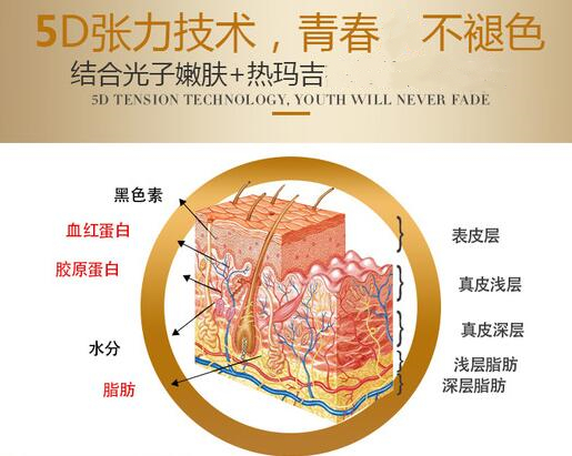 5d的含义其实是人体的5个肌肤层次,表皮层、真皮浅层、真皮深层、浅层脂肪层和深层脂肪层。这几个层次其实衰老的表现以及作用的深度都是有所不同的,当然这款激光设备其实也是为了让肌肤有着更好的体现,所以才实现一种分层的塑造方式,可以让肌肤的每一个层次都能得到改良,所以由内而外的散发出一种年轻感。