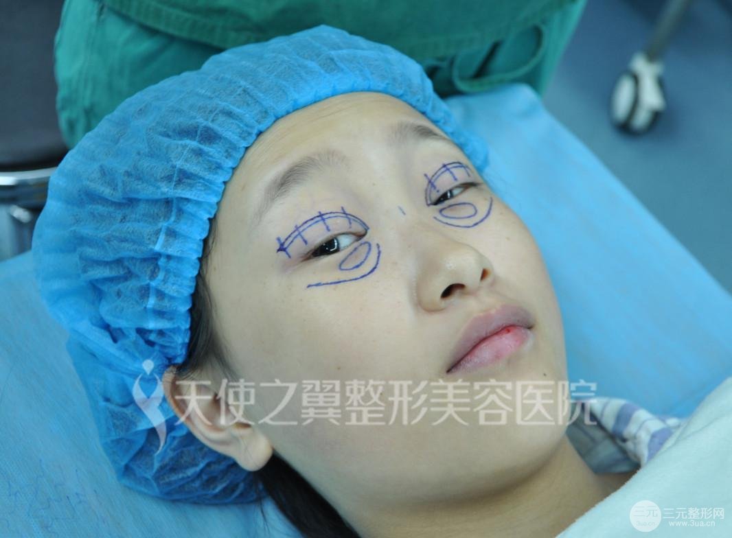 这是刚刚画完手术设计线,莫名有点好笑,哈哈~护士给我拍的,以后再也不会有单眼皮和眼袋的照片了,留着做个纪念,哈哈。