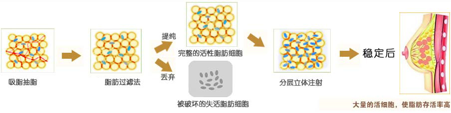 利用自体脂肪细胞进行注射填充,组织损伤较小,疼痛感较轻渗透技术,相容性好,被移植的脂肪细胞成活率高达92%,果更**。
